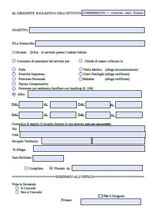 Dal primo gennaio 2017 c'è un nuovo modo di comunicare con la nostra Segreteria. Il modulo da utilizzare è scaricabile qui ed è da utilizzare per tutte le evenienze, tranne che per le malattie, nel qual caso occorre un semplice fonogramma col numero di certificato comunicato dal proprio medico, e le assenze "importanti", quali maternità, aspettativa...